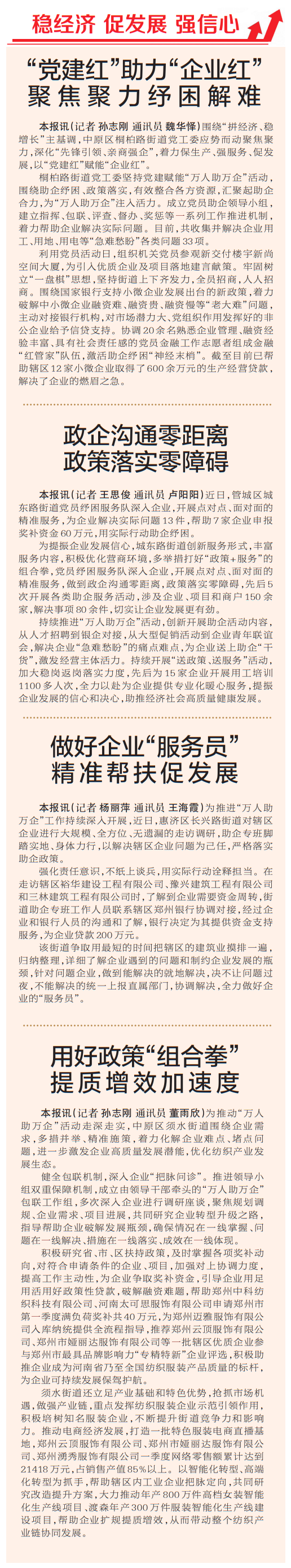 围绕“拼经济、稳增长”主基调,中原区桐柏路街道党工委应势而动聚焦聚力,深化“先锋引领、亲商强企”,着力保生产、强服务、促发展,以“党建红”赋能“企业红”。(今日《郑州日报》7版)