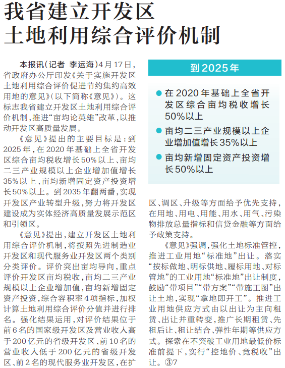4月17日,省政府办公厅印发《关于实施开发区土地利用综合评价促进节约集约高效用地的意见》。这标志我省建立开发区土地利用综合评价机制,推进“亩均论英雄”改革,以推动开发区高质量发展。(今日《河南日报》1版)