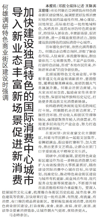市长何雄近日调研我市特色商业街区建设情况,强调要更好发挥消费对经济发展的基础性作用,精心谋划、因地制宜,高标准打造一批有地域特色、风格各异、规范有序的特色商业街区,持续导入新业态、丰富新场景、促进新消费,进一步释放夜经济活力,加快建设独具特色的国际消费中心城市。(今日《郑州日报》1版)