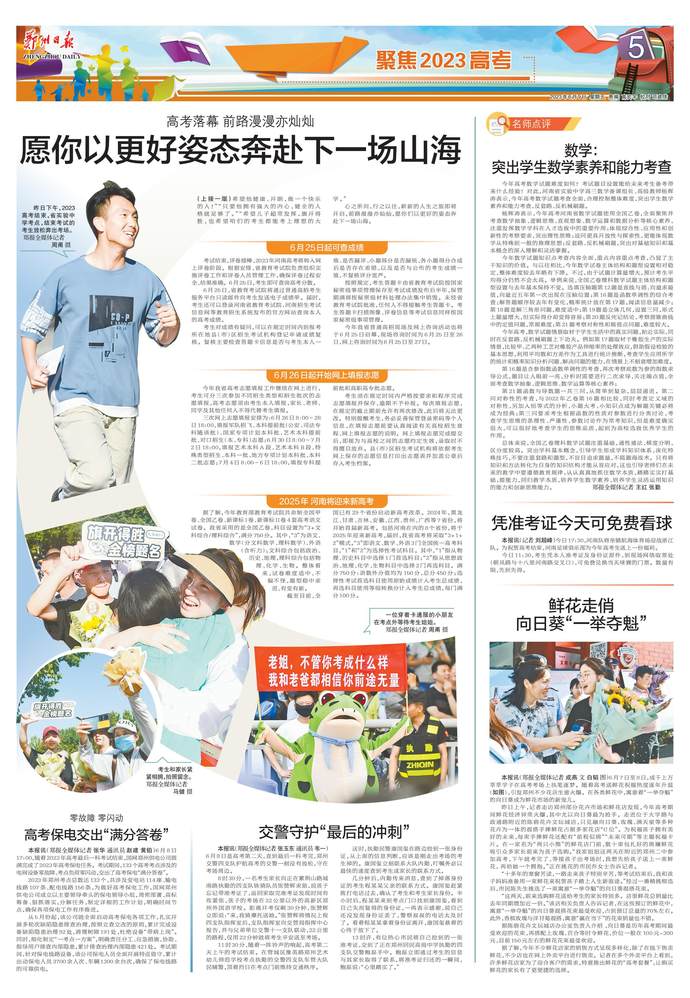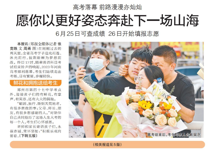 在刚刚过去的两天里,全省高考学子追光而遇、沐光而行,披荆斩棘为梦想而战。昨日17时,随着英语科目考试结束铃声的响起,2023年河南高考顺利落幕,考生们陆续走出考场,目有繁星,步履轻快。(今日《郑州日报》1版、5版)