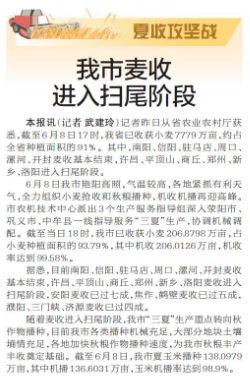 记者昨日从省农业农村厅获悉,截至6月8日17时,我省已收获小麦7779万亩,约占全省种植面积的91%。其中,南阳、信阳、驻马店、周口、漯河、开封麦收基本结束,许昌、平顶山、商丘、郑州、新乡、洛阳进入扫尾阶段。(今日《郑州日报》1版)