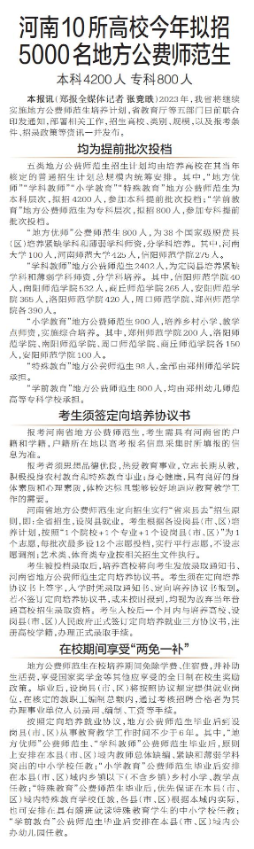 2023年,我省将继续实施地方公费师范生培养计划,省教育厅等五部门日前联合印发通知,部署相关工作,招生高校、类别、规模,以及报考条件、招录政策等资讯一并发布。(今日《郑州日报》2版)