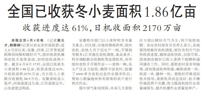 记者从农业农村部获悉:进入6月份以来,安徽、河南、江苏等地紧抓降雨间隙和晴好天气,组织收获机械和农机手连续奋战,加快抢收成熟小麦。截至6月8日17时,全国已收获冬小麦面积1.86亿亩,收获进度达61%。日机收面积2170万亩,当日投入小麦联合收割机28.9万台。安徽麦收进入尾声,河南进度过九成,江苏进度过半,山东进度过两成。(今日《人民日报》1版)