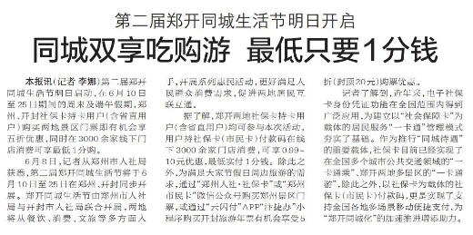 第二届郑开同城生活节明日启动,在6月10日至25日期间的周末及端午假期,郑州、开封社保卡持卡用户(含省直用户)购买两地景区门票即有机会享五折优惠,同时在3000余家线下门店消费可享最低1分购。(今日《郑州日报》2版)