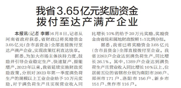 6月8日,记者从河南省政府获悉,省财政已将奖励资金3.65亿元(含市县资金)全部直接拨付至达产满产企业,实现政策红利直达快享。(今日《郑州日报》6版)