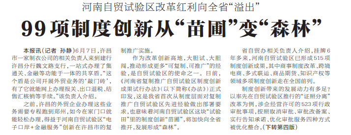 河南自贸试验区改革红利向全省“溢出”