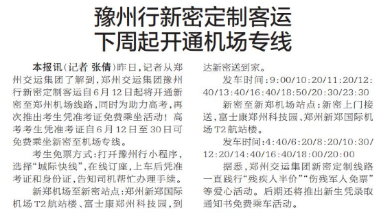 昨日,记者从郑州交运集团了解到,郑州交运集团豫州行新密定制客运自6月12日起将开通新密至郑州机场线路,同时为助力高考,再次推出考生凭准考证免费乘坐活动!高考考生凭准考证自6月12日至30日可免费乘坐新密至机场专线。(今日《郑州日报》6版)