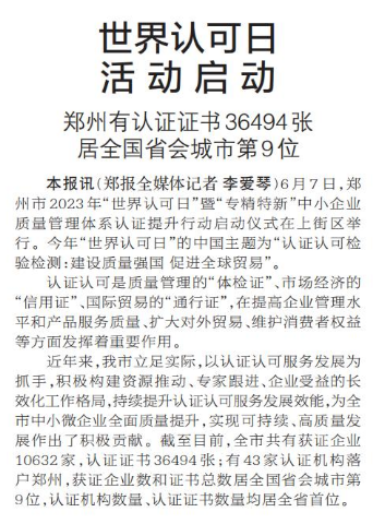 6月7日,郑州市2023年“世界认可日”暨“专精特新”中小企业质量管理体系认证提升行动启动仪式在上街区举行。今年“世界认可日”的中国主题为“认证认可检验检测:建设质量强国 促进全球贸易”。(今日《郑州日报》6版)