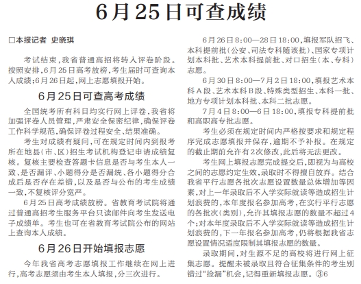 6月25日可查成绩 26日开始填报志愿