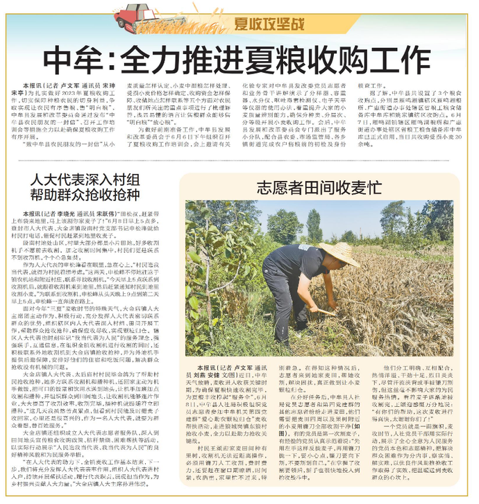 近日,中牟天气放晴,麦收进入收获关键时期,为确保夏粮快速收割完毕,为夏粮丰收撑起“服务伞”,6月8日,中牟县人社局积极组织党员志愿者参加中牟机关第四党建群“爱心助农颗粒归仓”麦收帮扶活动,走进狼城岗镇东狼村抢收小麦,全力以赴助力抢收关键战。(今日《郑州日报》7版)
