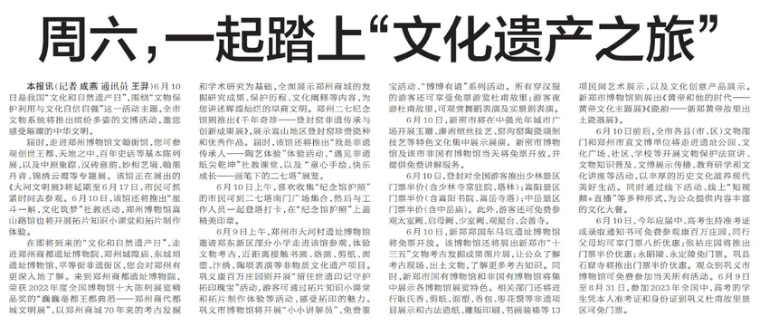 6月10日是我国“文化和自然遗产日”,围绕“文物保护利用与文化自信自强”这一活动主题,全市文物系统将推出缤纷多姿的文博活动,邀您感受璀璨的中华文明。(今日《郑州日报》8版)