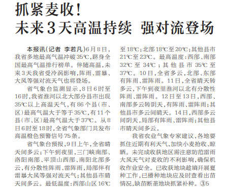 6月8日,我省多地最高气温冲破35℃,跻身全国最高气温排行榜单。伴随高温,未来3天我省受冷涡影响,阵雨、雷暴、大风等强对流天气也将登场。(今日《河南日报》4版)
