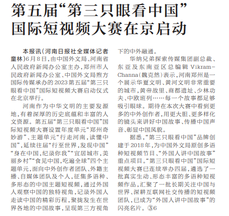 6月8日,由中国外文局、河南省人民政府新闻办公室主办,郑州市人民政府新闻办公室、中国外文局煦方国际传媒承办的2023第五届“第三只眼看中国”国际短视频大赛启动仪式在北京举行。(今日《河南日报》3版)