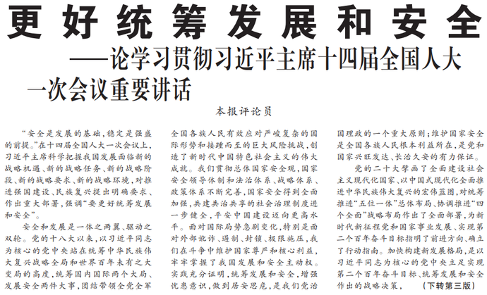 “安全是发展的基础,稳定是强盛的前提。”在十四届全国人大一次会议上,习近平主席科学把握我国发展面临新的战略机遇、新的战略任务、新的战略阶段、新的战略要求、新的战略环境,对推进强国建设、民族复兴提出明确要求、作出重大部署,强调“要更好统筹发展和安全”。(今日《人民日报》1版、3版)