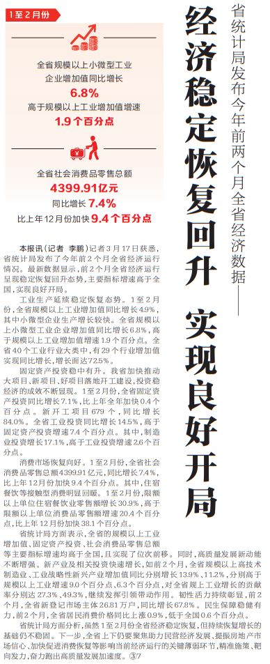 记者3月17日获悉,省统计局发布了今年前2个月全省经济运行情况。最新数据显示,前2个月全省经济运行呈现稳定恢复回升态势,主要指标增速高于全国,实现良好开局。(今日《河南日报》1版)