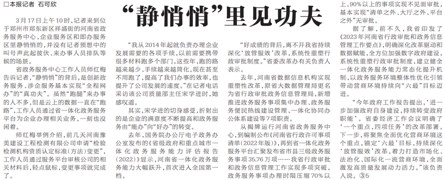 省政务服务中心工作人员师红梅告诉记者,“静悄悄”的背后,是创新政务服务、涉企服务基本实现“全程网办”的“真功夫”。虽然“跑腿”来办事的人不多,但是云上的数据一直在“跑路”,工作人员通过省一体化政务服务平台为企业办理相关业务,一刻也没闲着。(今日《河南日报》1版)