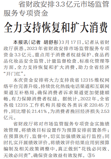 3月17日,记者从省财政厅获悉,2023年省财政安排市场监管服务专项资金3.3亿元,重点用于消费者权益保护、食品药品化妆品安全监管、计量监督检查、标准化管理等方面,全力支持恢复和扩大消费,助力全省经济“开门红”。(今日《河南日报》4版)
