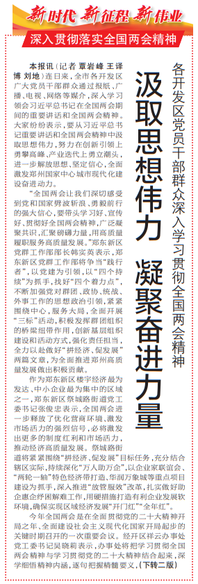 连日来,全市各开发区广大党员干部群众通过报纸、广播、电视、网络等媒介,深入学习领会习近平总书记在全国两会期间的重要讲话和全国两会精神。大家纷纷表示,要从习近平总书记重要讲话和全国两会精神中汲取思想伟力,努力在创新引领上勇攀高峰、产业迭代上勇立潮头,进一步解放思想、坚定信心,全面激发郑州国家中心城市现代化建设奋进动力。(今日《郑州日报》1版、2版)