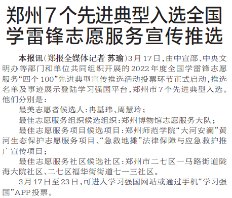3月17日,由中宣部、中央文明办等部门和单位共同组织开展的2022年度全国学雷锋志愿服务“四个100”先进典型宣传推选活动投票环节正式启动,推选名单及事迹展示登陆学习强国平台,郑州市7个先进典型入选。(今日《郑州日报》2版)