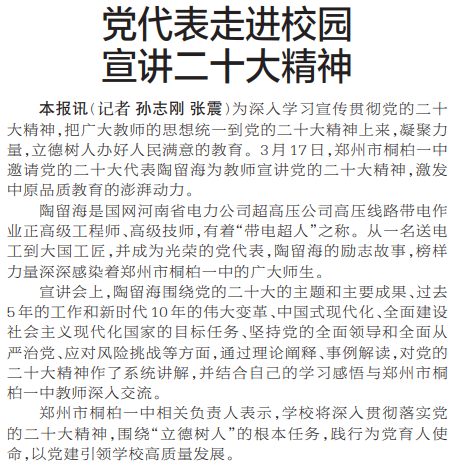为深入学习宣传贯彻党的二十大精神,把广大教师的思想统一到党的二十大精神上来,凝聚力量,立德树人办好人民满意的教育。3月17日,郑州市桐柏一中邀请党的二十大代表陶留海为教师宣讲党的二十大精神,激发中原品质教育的澎湃动力。(今日《郑州日报》2版)
