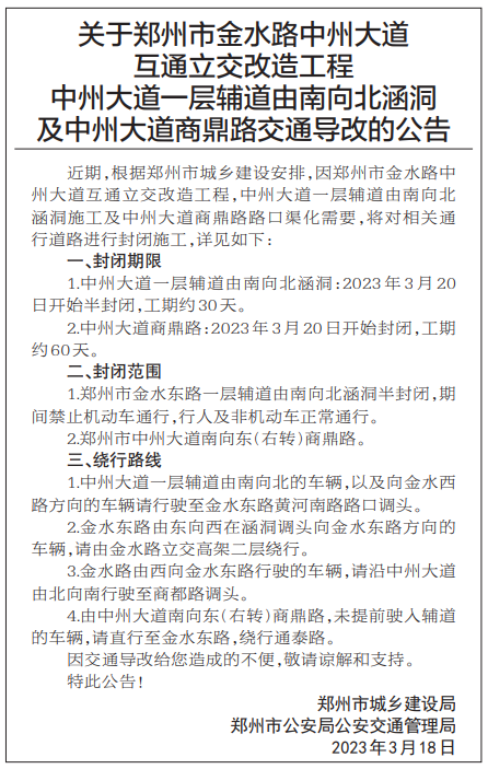 中州大道一层辅道由南向北涵洞及中州大道商鼎路交通导改的公告