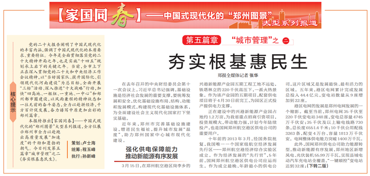 本报特推出【家国同春】——中国式现代化的“郑州图景”大型系列报道,全方位展示郑州市全力以赴跑出高质量发展“加速度”的干劲和蓬勃的朝气。今日刊发第五篇章“城市管理”之二《夯实根基惠民生》。