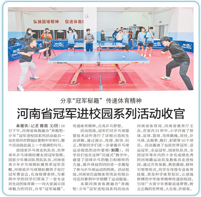 16日下午,河南省体教融合“奔跑吧·少年”冠军进校园系列活动最后一站在郑州市管城区紫荆中学举行,整个活动就此画上一个圆满的句号。(今日《郑州日报》4版)