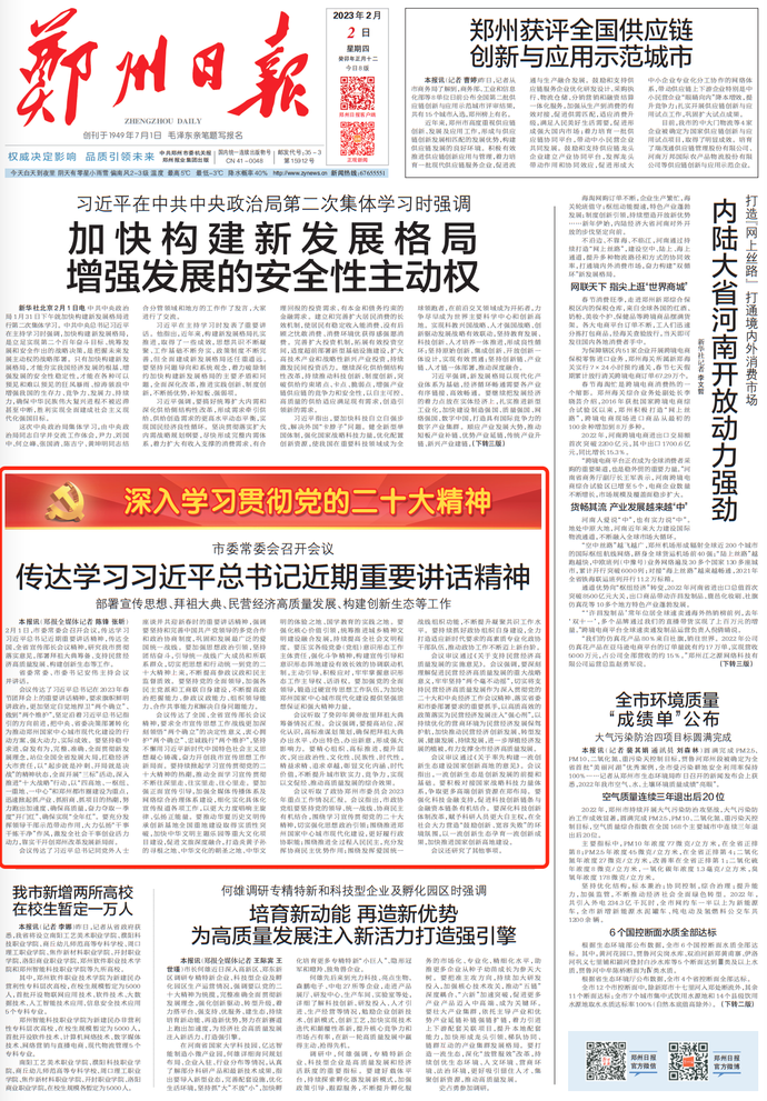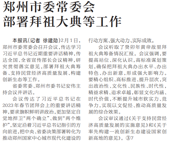 2月1日,郑州市委常委会召开会议,传达学习习近平总书记近期重要讲话精神,传达全国、全省宣传部长会议精神,研究贯彻落实意见,部署拜祖大典筹备、支持民营经济高质量发展、构建创新生态等工作。