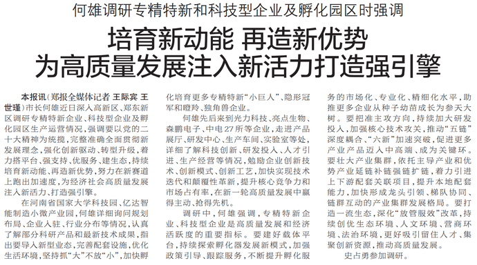 市长何雄近日深入高新区、郑东新区调研专精特新企业、科技型企业及孵化园区生产运营情况,强调要以党的二十大精神为统揽,完整准确全面贯彻新发展理念,强化创新驱动、转型升级,着力搭平台、强支持、优服务、建生态,持续培育新动能、再造新优势,努力在新赛道上跑出加速度,为经济社会高质量发展注入新活力、打造强引擎。(今日《郑州日报》1版)