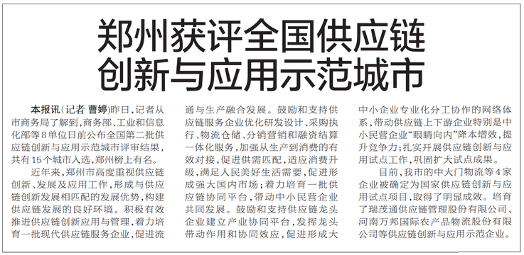 昨日,记者从市商务局了解到,商务部、工业和信息化部等8单位日前公布全国第二批供应链创新与应用示范城市评审结果,共有15个城市入选,郑州榜上有名。(今日《郑州日报》1版)