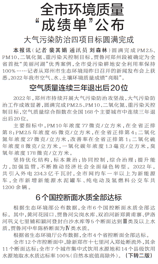 圆满完成PM2.5、PM10、二氧化氮、重污染天控制目标,贾鲁河郑州段被确定为全省首批“美丽河湖”优秀案例,全市受污染耕地安全利用率保持100%……记者从郑州市生态环境局昨日召开的新闻发布会上获悉,2022年我市空气、水、土壤环境质量成绩“亮眼”。(今日《郑州日报》1版、2版)