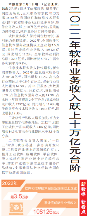 记者1日从工信部获悉:得益于广阔应用场景、巨大市场需求的有力支撑,2022年,我国软件和信息技术服务业(以下简称软件业)运行稳步向好,软件业务收入跃上10万亿元台阶,盈利能力保持稳定,软件业务出口保持增长。(今日《人民日报》1版)