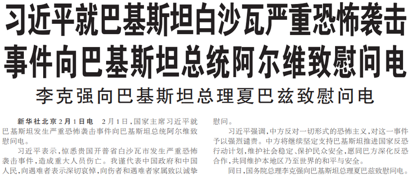 2月1日,国家主席习近平就巴基斯坦发生严重恐怖袭击事件向巴基斯坦总统阿尔维致慰问电。(今日《人民日报》1版)