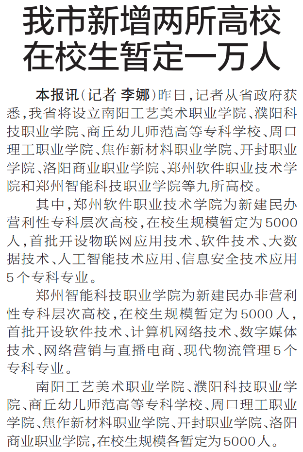 昨日,记者从省政府获悉,我省将设立南阳工艺美术职业学院、濮阳科技职业学院、商丘幼儿师范高等专科学校、周口理工职业学院、焦作新材料职业学院、开封职业学院、洛阳商业职业学院、郑州软件职业技术学院和郑州智能科技职业学院等九所高校。(今日《郑州日报》1版)