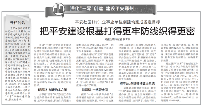为深入学习宣传贯彻党的二十大精神,持续营造建设更高水平平安郑州、法治郑州的浓厚舆论氛围,即日起,本报开设“深化‘三零’创建 建设平安郑州”专栏,全方位报道各级各部门深入贯彻落实党的二十大精神,坚持和发展新时代“枫桥经验”,深入推进“三零”创建工作的鲜活经验;集中呈现全市把党的二十大工作报告具体要求转化为忠诚担当、履职尽责的生动实践;深度挖掘不断增强人民群众获得感、幸福感、安全感征程上的先进典型……通过营造人人参与创建的浓厚氛围,持续提升全市“三零”平安创建常态化、长效化水平。