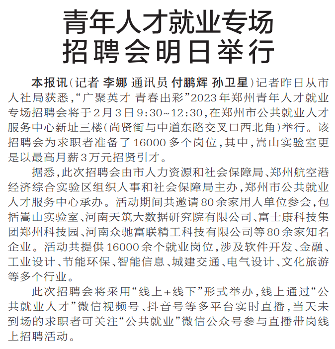 记者昨日从市人社局获悉,“广聚英才 青春出彩”2023年郑州青年人才就业专场招聘会将于2月3日9:30~12:30,在郑州市公共就业人才服务中心新址三楼(尚贤街与中道东路交叉口西北角)举行。该招聘会为求职者准备了16000多个岗位,其中,嵩山实验室更是以最高月薪3万元招贤引才。(今日《郑州日报》2版)