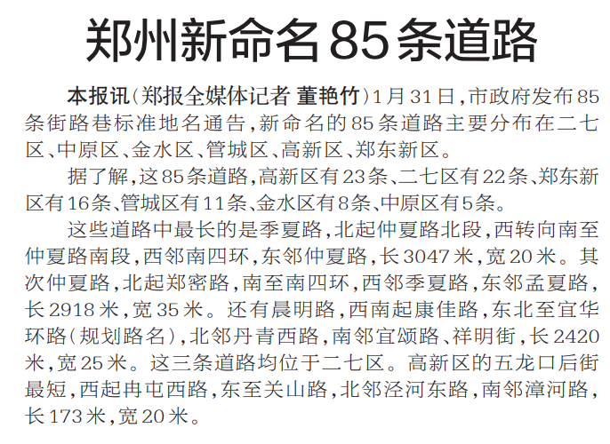 1月31日,市政府发布85条街路巷标准地名通告,新命名的85条道路主要分布在二七区、中原区、金水区、管城区、高新区、郑东新区。(今日《郑州日报》2版)
