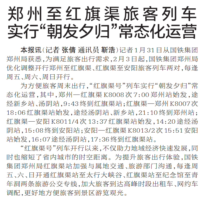 记者1月31日从国铁集团郑州局获悉,为满足旅客出行需求,2月3日起,国铁集团郑州局优化调整开行郑州至红旗渠、红旗渠至安阳旅客列车两对,每逢周五、周六、周日开行。(今日《郑州日报》2版)