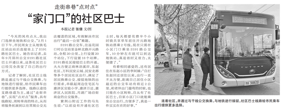 “今天的风有点大,我出门选择坐地铁和公交。”2月1日下午,市民周女士从地铁毛庄站出站后直接坐上了S191路社区巴士。她告诉记者,去年9月郑州公交S191路社区巴士开通以来,这条社区巴士已经完全改变了自己的出行方式。(今日《郑州日报》2版)