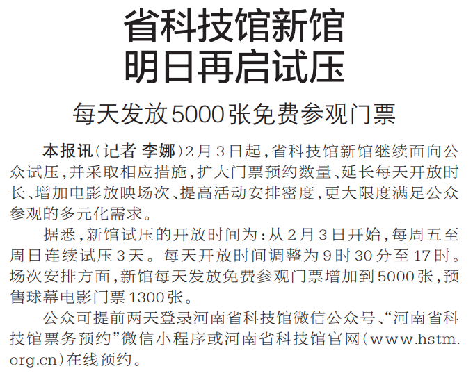 2月3日起,省科技馆新馆继续面向公众试压,并采取相应措施,扩大门票预约数量、延长每天开放时长、增加电影放映场次、提高活动安排密度,更大限度满足公众参观的多元化需求。(今日《郑州日报》2版)