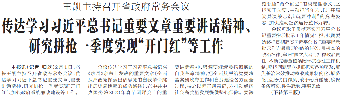 2月1日,省长王凯主持召开省政府常务会议,传达学习习近平总书记重要文章、重要讲话精神,研究拼抢一季度实现“开门红”、加强政府系统廉政建设等工作。(今日《河南日报》1版、3版)