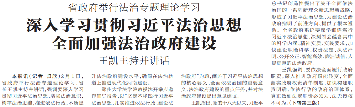 2月1日,省政府举行法治专题理论学习,省长王凯主持并讲话,强调要深入学习贯彻习近平法治思想,增强法治意识,树牢法治思维,推进依法行政,不断提升法治政府建设水平,确保在法治轨道上推进现代化河南建设。(今日《河南日报》1版、3版)