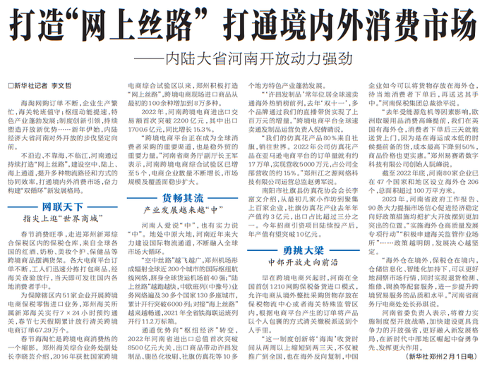 不沿边、不靠海、不临江,河南通过持续打造“网上丝路”,建设空中、陆上、海上通道,提升多种物流路径和方式的协同效率,打通境内外消费市场,奋力构建“双循环”新发展格局。(今日《河南日报》2版)
