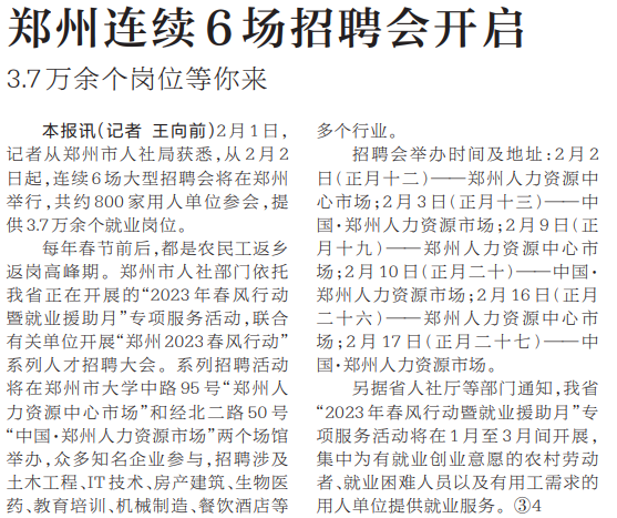 2月1日,记者从郑州市人社局获悉,从2月2日起,连续6场大型招聘会将在郑州举行,共约800家用人单位参会,提供3.7万余个就业岗位。(今日《河南日报》4版)