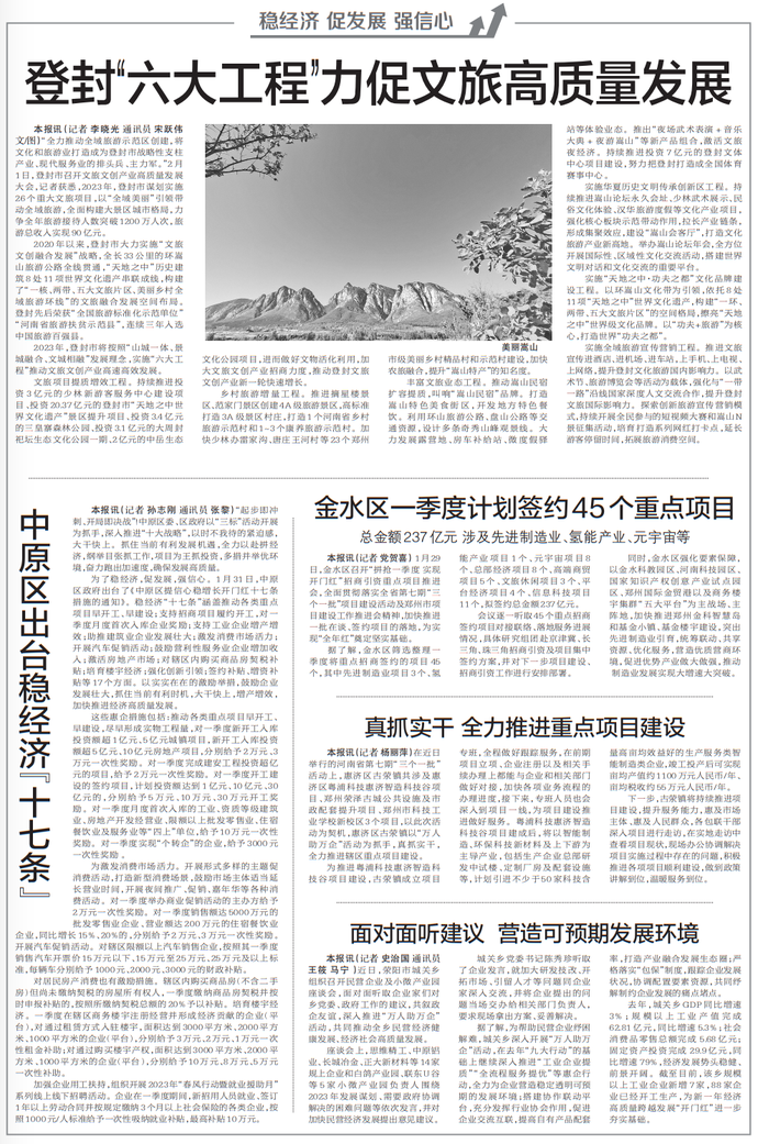 1月29日,金水区召开“拼抢一季度 实现开门红”招商引资重点项目推进会,全面贯彻落实全省第七期“三个一批”项目建设活动及郑州市项目建设工作推进会精神,加快推进一批在谈、签约项目的落地,为实现“全年红”奠定坚实基础。(今日《郑州日报》7版)