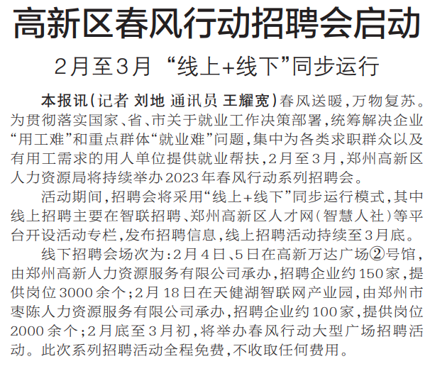 春风送暖,万物复苏。为贯彻落实国家、省、市关于就业工作决策部署,统筹解决企业“用工难”和重点群体“就业难”问题,集中为各类求职群众以及有用工需求的用人单位提供就业帮扶,2月至3月,郑州高新区人力资源局将持续举办2023年春风行动系列招聘会。(今日《郑州日报》7版)