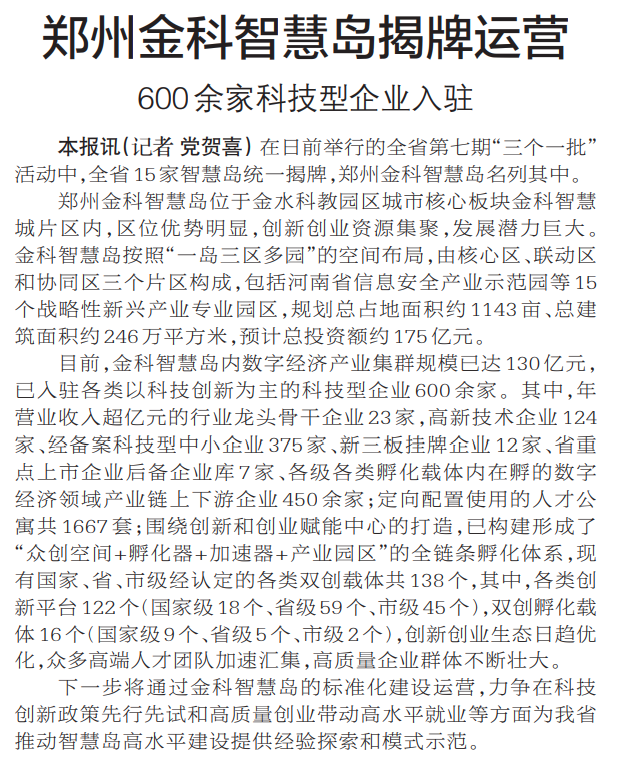 在日前举行的全省第七期“三个一批”活动中,全省15家智慧岛统一揭牌,郑州金科智慧岛名列其中。(今日《郑州日报》7版)