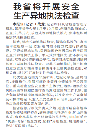 我省将开展安全生产异地执法检查