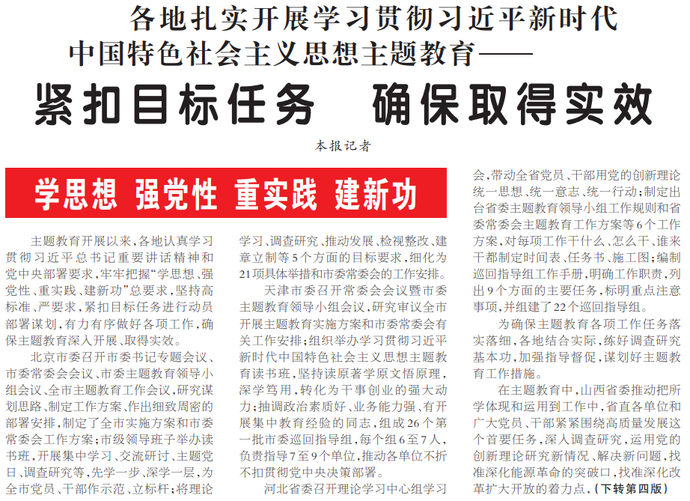 主题教育开展以来,各地认真学习贯彻习近平总书记重要讲话精神和党中央部署要求,牢牢把握“学思想、强党性、重实践、建新功”总要求,坚持高标准、严要求,紧扣目标任务进行动员部署谋划,有力有序做好各项工作,确保主题教育深入开展、取得实效。(今日《人民日报》1版、4版)
