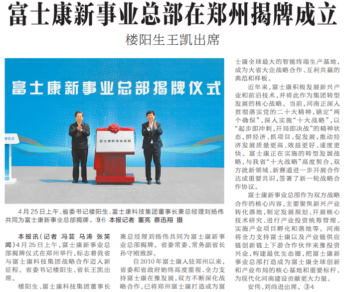 4月25日,富士康新事业总部揭牌仪式在郑州举行。富士康科技集团董事长兼总经理刘扬伟在揭牌仪式上表示,这既是富士康集团在中国大陆继往开来、持续深耕的重要里程碑,也是其面向未来发力战略产业的新起点。(今日《河南日报》2版)